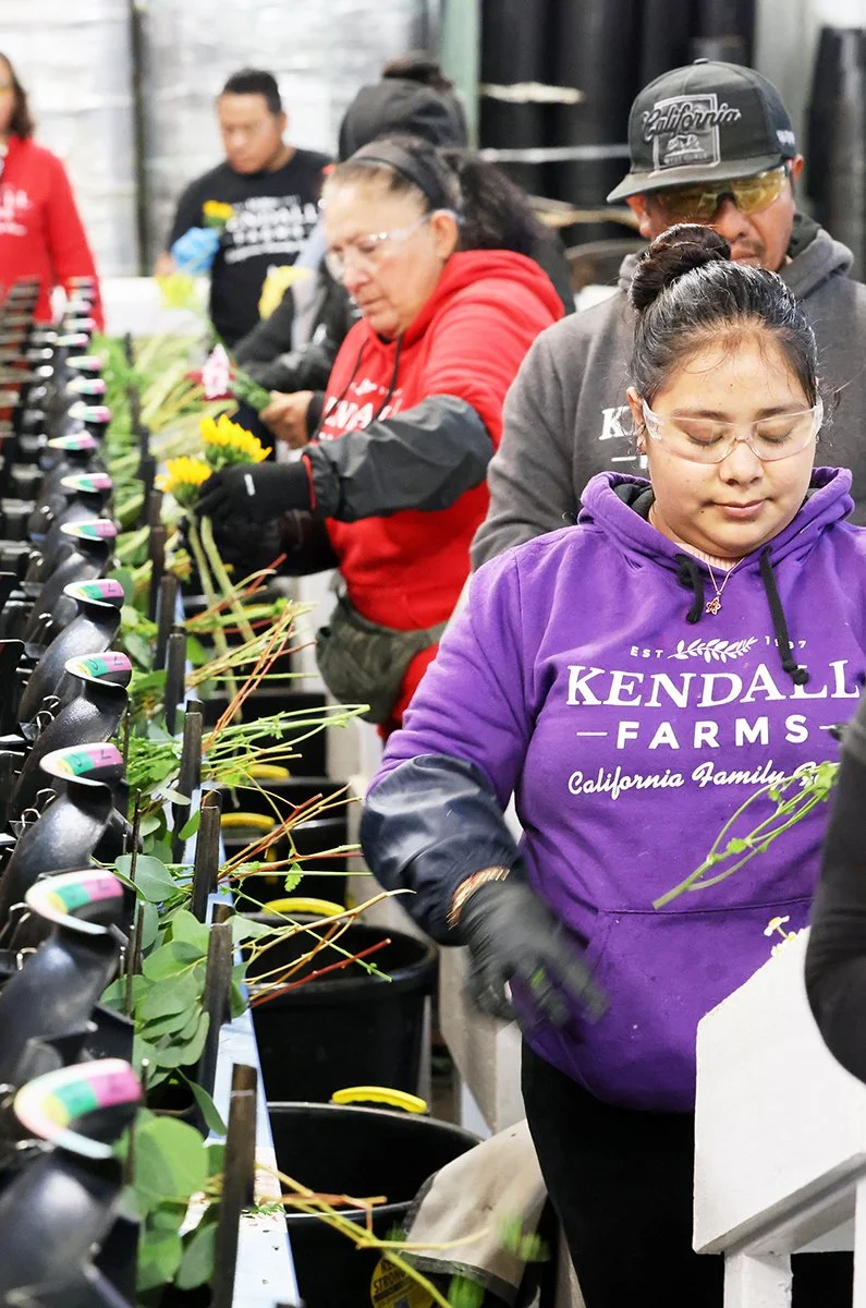 Today we’ll see how the Beautiful Flowers- they grow at Kendall Farms are assembled into Bouquets and shipped- to stores across the country. In our First Visit to Kendall Farms 12 years for the CA Grown Experience (Watch that Video here)… there were many bouquet assemblers- each making a bouquet from a selection of flowers- laid out on a large tables… but today- Innovation has taken center stage- with a Bouquet Making Assembly Line- where each person- places a flower into a strategic place in a special conveyor belt- which then assembles a ‘hand tied’ look bouquet- at the end… where that bouquet is then examined and approved by Flower Bouquet Experts- to ensure that every bouquet is Perfect. This was amazing to experience- and you can watch it in operation in this video.