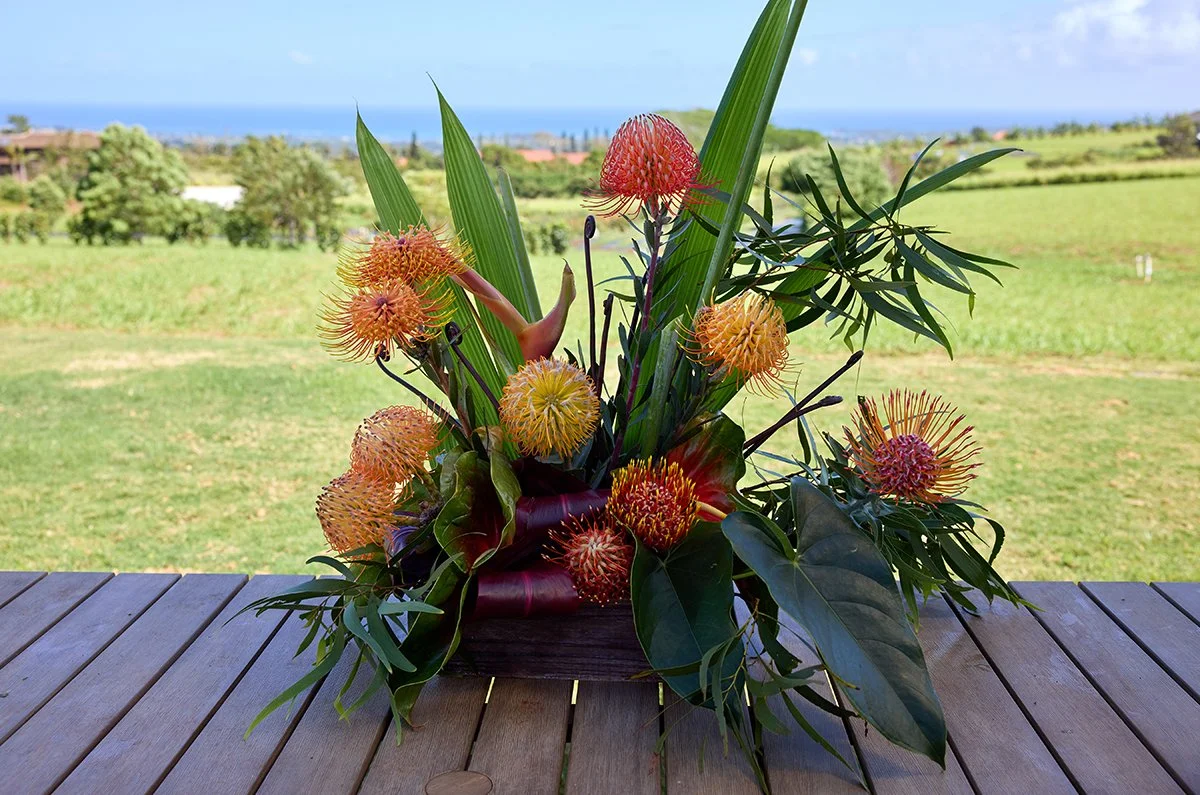 I’m On Location today- at Two Bee’s Protea Farm-where Flower Farmer- Jamie Barton- grows incredible Pin Cushion Protea- and other amazing Hawaiian Flowers and Foliage… Jamie picked several of her favorite Pin Cushion Protea (Luecospermum) for me to use in this arrangement.