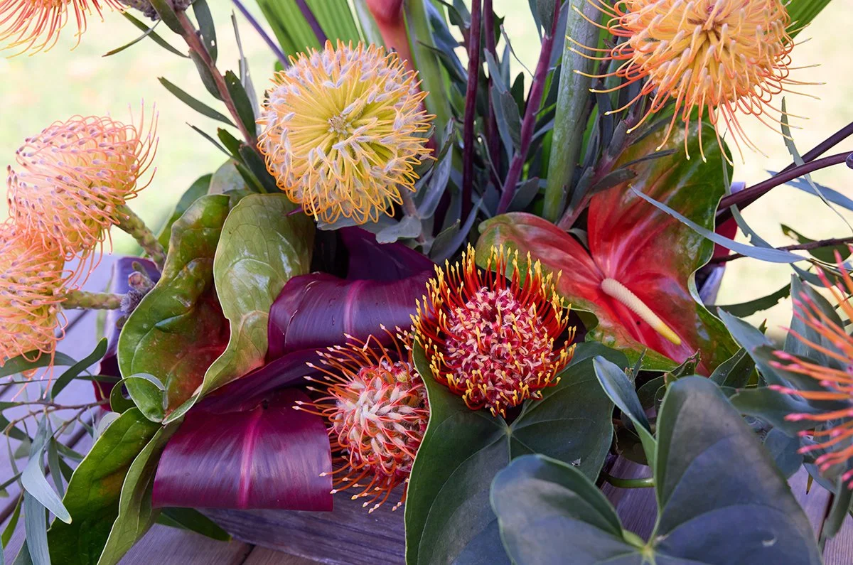I’m creating it an a wooden box-with Oasis Foraged Flower Foam… and I’m also using some Obake Anthurium and Foliage from Green Point Nursery… this is a Magical Place to arrange flowers- and these Pin Cushion Protea are the Perfect Pairing for this Island Stop on the North Shore of Oahu! Learn more about Two Bee’s Protea Here: https://www.instagram.com/twobeesprotea/?hl=en
