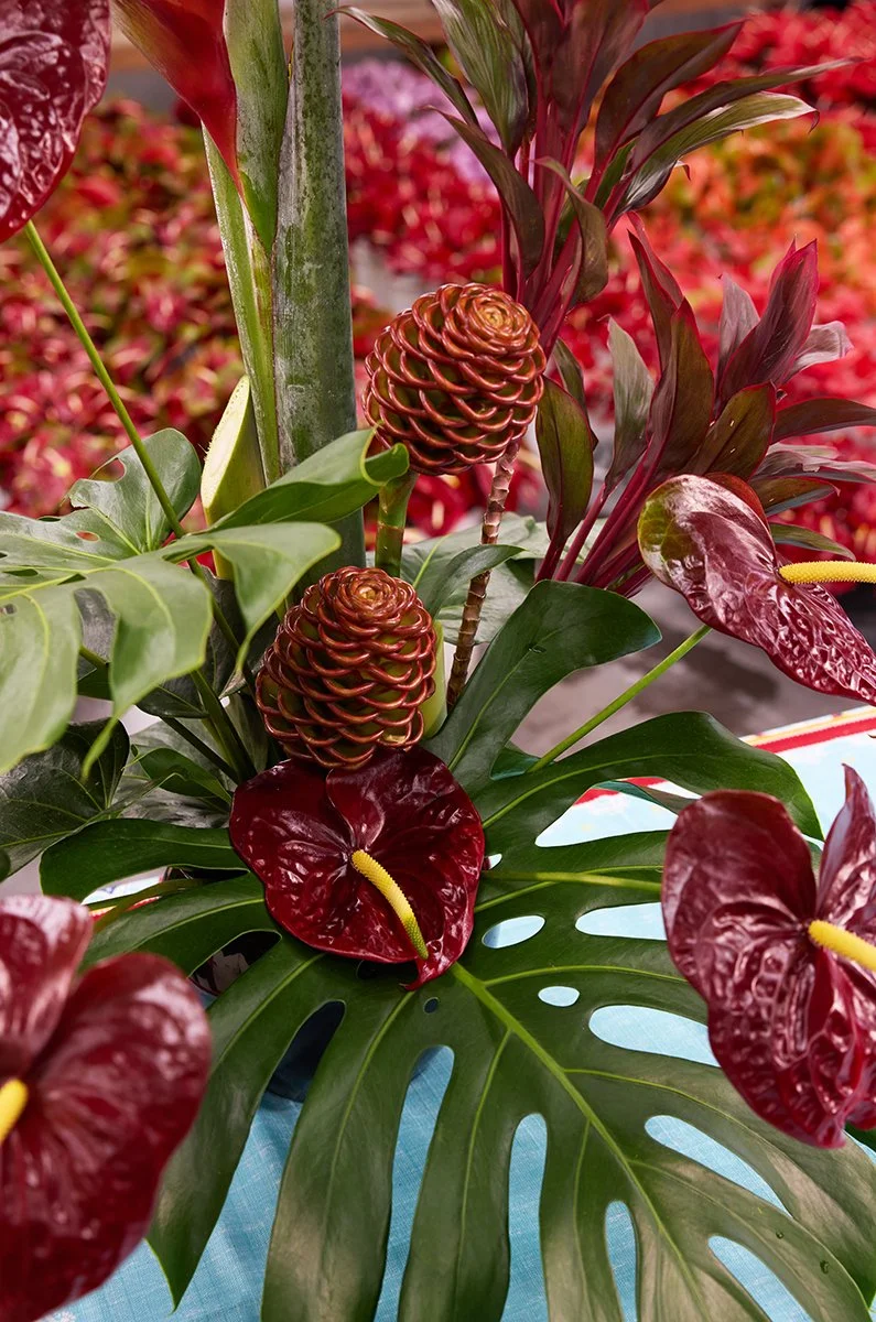 For this arrangement I was, delighted, honored and so grateful to select these amazing flowers… I started by Choosing a gorgeous Caribaeaous Heliconia- that paired perfectly with the “Spectabulous” Shampoo Ginger- it’s a deep burgundy color- and it’s jaw dropping… “Spectabulous” is the perfect variety name for this Incredible Flower… I also chose a NEW yet to be named- Anthurium… I also select GIANT Monstera Leaves- that are the biggest I’ve even seen… and some Ti Tops- which are the entire stem of a Ruby Ti Leaf Plant… and of course the trademark Anthurium Foliage that Green Point Nurseries is know for… I’m like a kid in a candy store- with all the Beautiful Tropical Flowers from our Friends at Green Point Nursery.