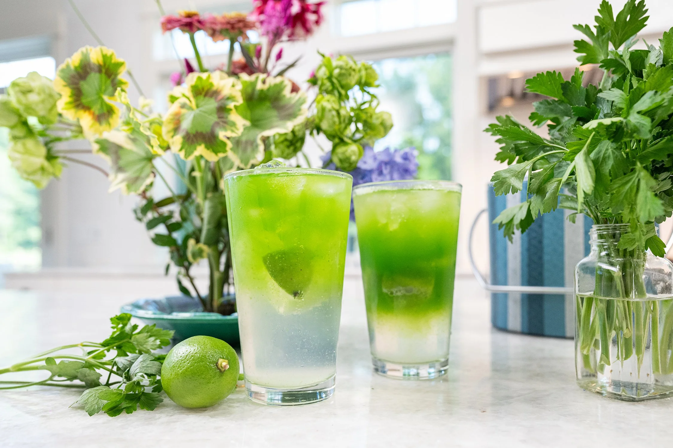 Lime club soda. Float 1 to 2 teaspoons of the Parsley juice on top. Enjoy!