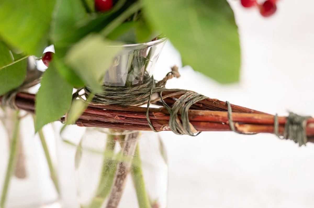 Enter my friend Patty- with her brilliant Gilligan’s Island Vase Treatment… using branch material of any type- and craft wire- You bind the branches around the necks of the vases- connecting them into a wonderful trio of vases- that you can use for flower arranging… You’ll see this in the video- and I’m sure you’ll come up with some vases you want to tie together. I used Pussy willow for this trio- you could use any type of branches for yours.